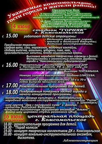 23 апреля в пгт.Старобешево пройдет греческий православный праздник «Арту»в рамках мероприятия состоится: - катание хлеба-«артоза»; - выступления греческих коллективов художественной самодеятельности района; -участие в конкурсах греческих частушек, поговорок и пословиц; - выставка-дегустация греческих блюд; - праздничная торговля; после окончания греческого престольного праздника «Арту» вас приглашает на свой концерт группа «ДЖАНГО» г.Москва Место проведения: пгт.Старобешево, РЦКиД им.П.Ангелиной . Начало в 14:00. |