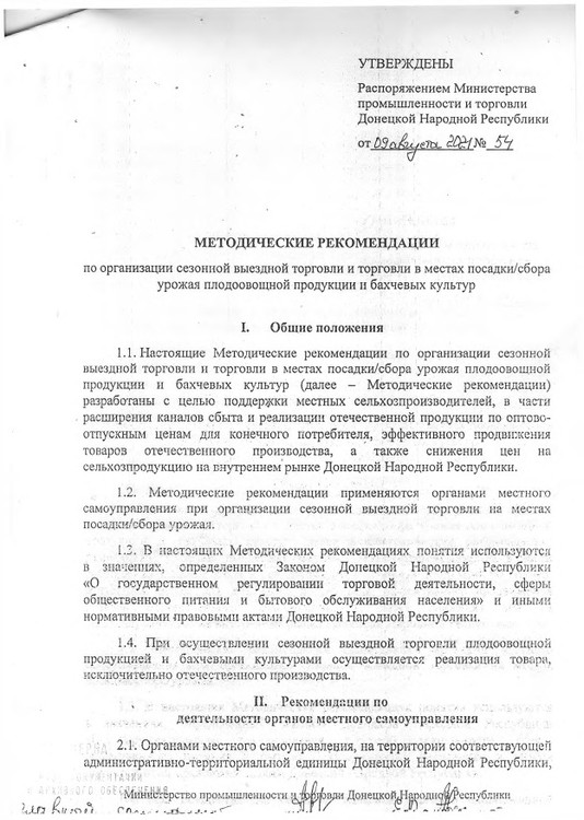 Администрация Старобешевского района уведомляет о разработке Методических рекомендаций по организации сезонной выездной торговли и торговли в местах посадки/сбора урожая плодоовощной продукции и бахчевых культур, утвержденных распоряжением Министерства промышленности и торговли Донецкой Народной Республики от 09 августа 2021 года №54 (прилагаются). Для участия в сезонной выездной торговле и торговле в местах посадки/сбора урожая плодоовощной продукции и бахчевых культур обращаться в отдел экономического развития и торговли администрации Старобешевского района по телефону 2-10-68, 2-15-38. |