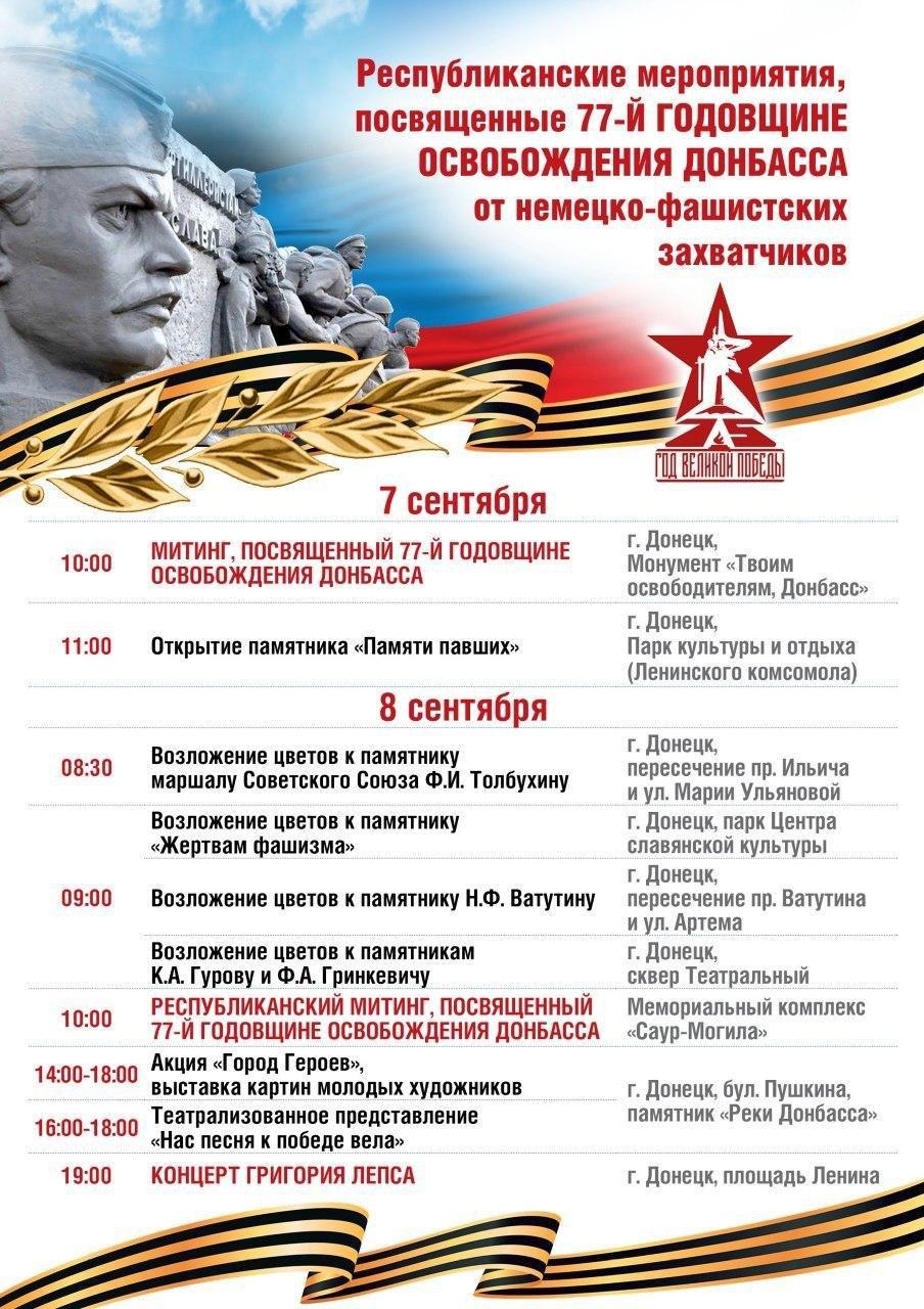 8 сентября 2020 г. у Мемориального комплекса «Саур-Могила» состоится Республиканский митинг, посвященный 77-й годовщине освобождения Донбасса от немецко-фашистских захватчиков.
