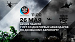 26 мая 2014 года в 11:00 был нанесен первый авиаудар по Донецкому аэропорту. В этот день в Донбассе началась война. В седьмую годовщину трагической даты в истории Донецкой Народной Республики, 26 мая, в 11:00 Общественное Движение «Донецкая Республика» призывает жителей Республики принять участие в акции и почтить память погибших в этой войне общим нажатием на сигнал автомобиля, сиреной или гудком на предприятии. Дата, принесшая смерть в Донбасс, не должна быть забыта! Присоединяйтесь!