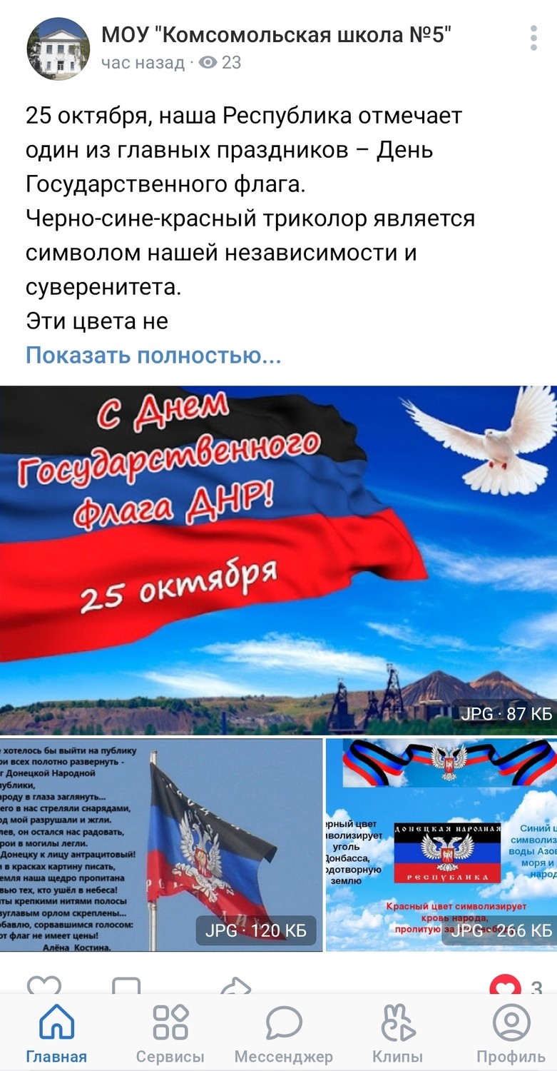 В честь Дня Государственного флага Донецкой Народной Республики в школах Старобешевского района 25 октября 2021 года прошел ряд заочных мероприятий, посвященных этой дате: -электронные буклеты на сайтах «25 октября - День Государственного флага ДНР», «Флаг – символ Родины»; -дистанционные, информационные часы «История флага», «Государственные символы», «Флаг в жизни государства»; -библиотечные онлайн - выставки; -онлайн - лектории «Что означают цвета флага ДНР», «Интересные факты о флаге» и др.; -размещены презентации на сайтах и соцсетях общеобразовательных учреждений.