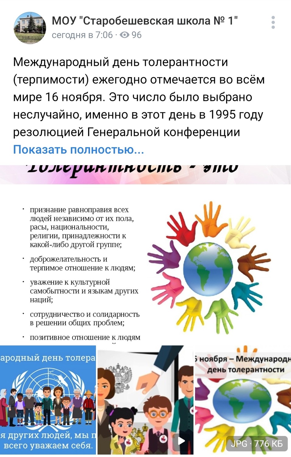 В школах Старобешевского района 16 ноября 2021 года прошел ряд заочных мероприятий, посвященных Международному дню толерантности. На сайтах и соцсетях общеобразовательных учреждений были проведены онлайн – уроки на темы: «Ты и я - мы оба разные, ты и я - мы оба классные», «Толерантность - это...», «В мире добра, любви и красоты», «Толерантность – дорога к миру» и др. Учащиеся подготовили веб - презентации, стихи; оформили информационные страницы о важности толерантности в современном мире, насколько она необходима в отношениях, как между отдельными людьми, так и на уровне семьи и коллектива.