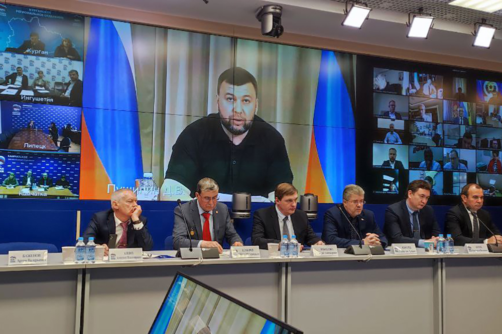 В четверг, 26 мая, Глава Донецкой Народной Республики Денис Пушилин в онлайн-режиме принял участие в работе дискуссионной площадки «Экономическая интеграция с Донбассом и освобожденными территориями». Мероприятие состоялось в рамках форума «Предпринимательство в новой экономической реальности», организованного Всероссийской политической партией «Единая Россия». Модератором дискуссии выступил первый заместитель Председателя Совета Федерации Федерального Собрания Российской Федерации, секретарь Генерального совета партии «Единая Россия» Андрей Турчак. Также в мероприятии приняли участие Глава Луганской Народной Республики Леонид Пасечник, Глава Республики Крым Сергей Аксенов, глава Херсонской областной военно-гражданской администрации Владимир Сальдо, депутаты Госдумы РФ Дмитрий Саблин, Виктор Водолацкий, Артем Туров, Алексей Волоцков, представители министерств и ведомств Российской Федерации.