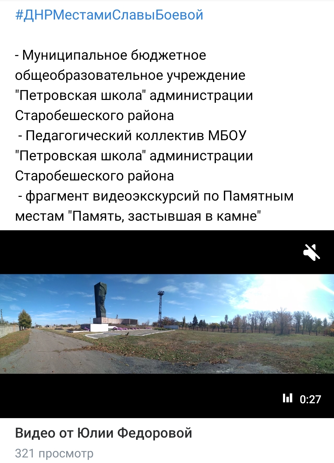 В рамках Года молодежи, с целью патриотического воспитания обучающихся 02 июня 2022 г. в муниципальных бюджетных общеобразовательных учреждениях Старобешевского района были проведены видеоэкскурсии «Местами Славы Боевой». Педагогами и обучающимися были подготовлены тематические веб – презентации и мультимедийные ролики по истории родного края и биографии героев Великой Отечественной войны; принято участие в хэштегах #ДНРМестамиСлавыБоевой.