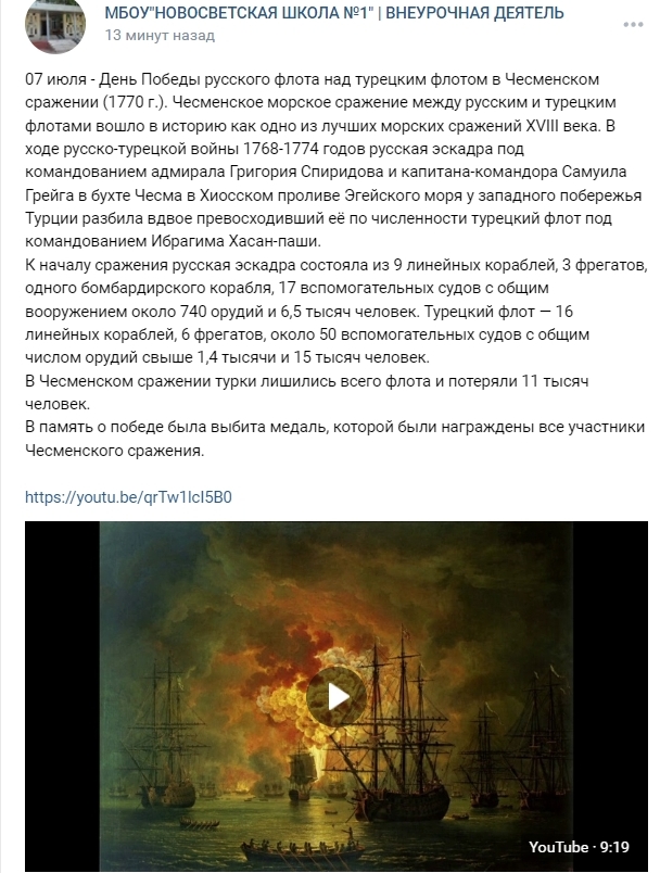 В рамках Года молодежи, с целью патриотического воспитания подрастающего поколения 07 июля 2022 года муниципальными бюджетными общеобразовательными учреждениями Старобешевского района были проведены единые онлайн - лектории, посвященные Дню Победы русского флота над турецким флотом в Чесменском сражении (1770 год).