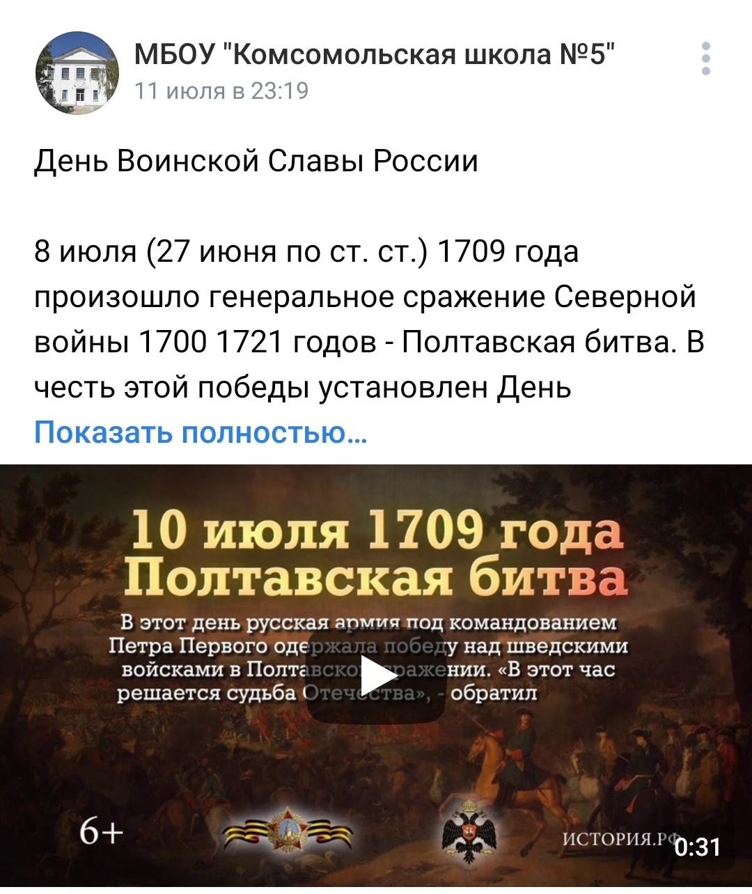 В рамках Года молодежи, с целью патриотического воспитания подрастающего поколения 11 - 13 июля 2022 года муниципальными бюджетными общеобразовательными учреждениями Старобешевского района были проведены единые онлайн - лектории, посвященные Дню Победы русской армии под командованием Петра Первого над шведами в Полтавском сражении (1709 год).