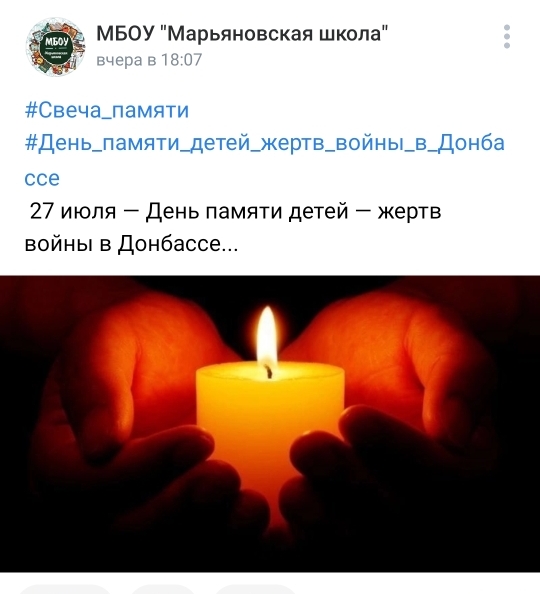27 июля 2022 г. в рамках Дня памяти детей – жертв войны в Донбассе муниципальными бюджетными общеобразовательными учреждениями Старобешевского района были проведены мемориальные мероприятия. На электронно – информационных ресурсах школ при активном участии педагогов и обучающихся подготовлены траурные ленты, Свечи Памяти; фотоколлажи и минуты молчания – онлайн.