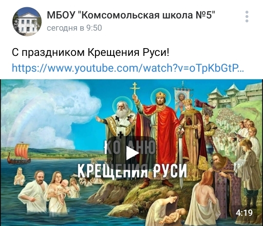 28 июля 2022 года в муниципальных бюджетных общеобразовательных учреждениях Старобешевского района прошли единые дистанционные мероприятия, посвященные Дню Крещения Руси. На школьных электронных ресурсах были проведены видеолектории, онлайн - выставки, информационные минуты: «28 июля – День Крещения Руси», «История христианства», «Этот священный день», «Святыни Руси», «Величие храмов» и др. При активном участии школьников и педагогов были подготовлены веб – презентации.