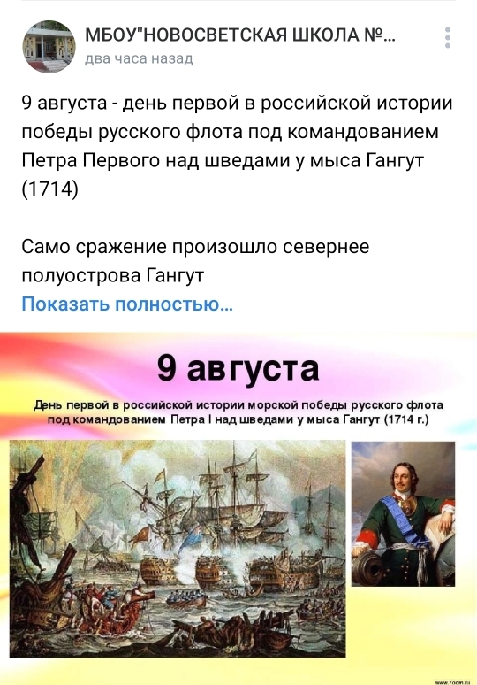 В рамках Года молодежи, с целью патриотического воспитания подрастающего поколения 09 августа 2022 года муниципальными бюджетными общеобразовательными учреждениями Старобешевского района были проведены единые онлайн - лектории, посвященные Дню первой в российской истории морской победы русского флота под командованием Петра Первого над шведами у мыса Гангут (1714).
