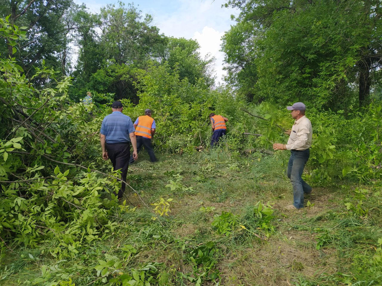 Сегодня, 25 мая, силами сотрудников МЧС и работников, занятых на работах временного характера, в городе Комсомольское выполнены работы по расчистке подъездного пути к реке Кальмиус, для забора воды техникой МЧС.