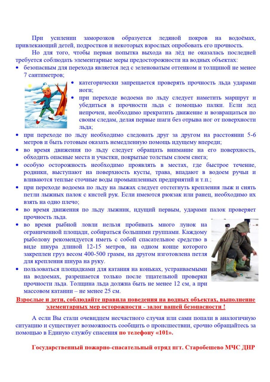 При усилении заморозков образуется ледяной покров на водоёмах, привлекающий детей, подростков и некоторых взрослых опробовать его прочность. Но для того, чтобы первая попытка выхода на лёд не оказалась последней требуется соблюдать элементарные меры предосторожности на водных объектах: безопасным для перехода является лед с зеленоватым оттенком и толщиной не менее 7 сантиметров; категорически запрещается проверять прочность льда ударами ноги; при переходе водоема по льду следует наметить маршрут и убедиться в прочности льда с помощью палки. Если лед непрочен, необходимо прекратить движение и возвращаться по своим следам, делая первые шаги без отрыва ног от поверхности льда; при переходе по льду необходимо следовать друг за другом на расстоянии 5-6 метров и быть готовым оказать немедленную помощь идущему впереди; во время движения по льду следует обращать внимание на его поверхность, обходить опасные места и участки, покрытые толстым слоем снега; особую осторожность необходимо проявлять в местах, где быстрое течение, родники, выступают на поверхность кусты, трава, впадают в водоем ручьи и вливаются теплые сточные воды промышленных предприятий и т.п.; при переходе водоема по льду на лыжах следует отстегнуть крепления лыж и снять петли лыжных палок с кистей рук. Если имеются рюкзак или ранец, необходимо их взять на одно плечо; во время движения по льду лыжник, идущий первым, ударами палок проверяет прочность льда. во время рыбной ловли нельзя пробивать много лунок на ограниченной площади, собираться большими группами. Каждому рыболову рекомендуется иметь с собой спасательное средство в виде шнура длиной 12-15 метров, на одном конце которого закреплен груз весом 400-500 грамм, на другом изготовлена петля для крепления шнура на руку. пользоваться площадками для катания на коньках, устраиваемыми на водоемах, разрешается только после тщательной проверки прочности льда. Толщина льда должна быть не менее 12 см, а при массовом катании – не менее 25 см. Взрослые и дети, соблюдайте правила поведения на водных объектах, выполнение элементарных мер осторожности - залог вашей безопасности ! А если Вы стали очевидцем несчастного случая или сами попали в аналогичную ситуацию и существует возможность сообщить о происшествии, срочно обращайтесь за помощью в Единую службу спасения по телефону «101». Государственный пожарно-спасательный отряд пгт. Старобешево МЧС ДНР | |