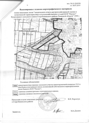 18 июля 2019 года в администрацию Старобешевского района поступило ходатайство (заявление) ФЛП Д. о предоставлении разрешения на разработку проекта землеустройства по отводу земельного участка, ориентировочной площадью 15,0 га (пастбища естественные), для выпаса скота,земли коллективной собственности нераспределенные земли бывшего КСП «Рассвет» расположенного на территории Кумачовской сельской администрации Старобешевского района, Донецкой Народной Республики для передачи в аренду сроком на 10 лет. Данные о земельном участке в соответствии с выкопировкой с планово картографического материала, выданными отделом Госкомзема ДНР в Старобешевском районе № 01-24/4596 (выкопировка прилагается)
