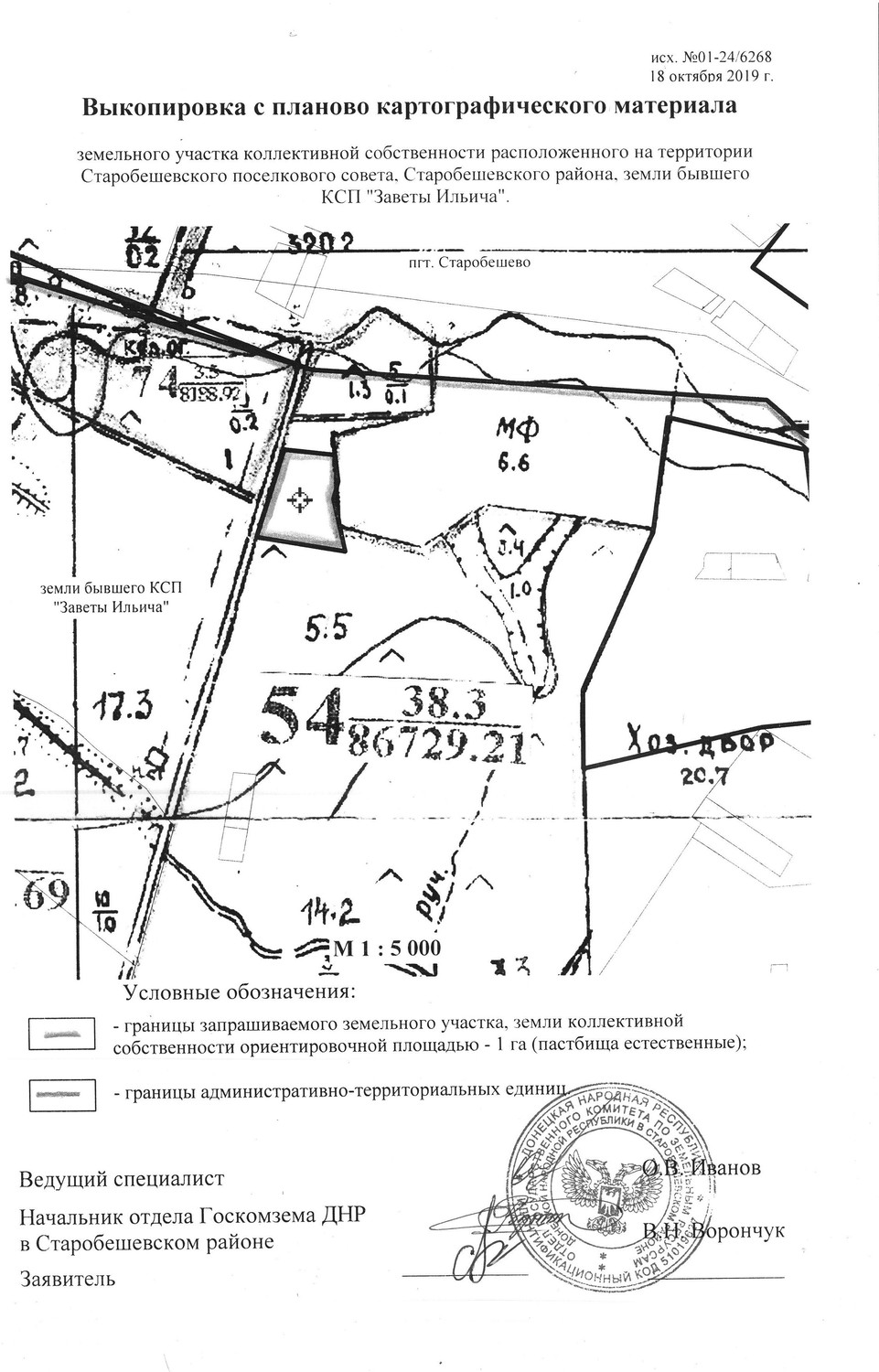| Администрация Старобешевского района информирует о неиспользуемых земельных участках сельскохозяйственного назначения и о намерении передать их в аренду для использования их по целевому назначению заинтересованным лицам. Просим предоставить информацию от собственников (пользователей), наследников, правопреемников, уполномоченных лицах о намерении использования указанных земельных участков, предоставить согласие на передачу их в аренду по телефону: 2-25-14 отдел архитектуры администрации каб. 113, в соответствии с исполнением полномочий, предусмотренных пунктом 5.5 Временного порядка предоставления в постоянное пользование и передачи в аренду земельных участков на территории Донецкой Народной Республики, утвержденного Постановлением Совета Министров Донецкой Народной Республики от 02.09.2015 №17-15 (с изменениями и дополнениями). Земельныеучастки расположенные на территории Старобешевскойпоселковой администрации, земли коллективной собственности бывшего КСП «Заветы Ильича» (согласно приложения): земельный участок площадью -1,00 га. (пастбища естественные) По истечению двухмесячного срока, в случае отсутствия официальной информации от собственников (пользователей), а также их наследников, правопреемников и уполномоченных лиц, будет принято решение уполномоченным органом исполнительной власти о передаче заинтересованному лицу (арендатору) земельного участка в аренду для использования по целевому назначению. Договор аренды таких земельных участков заключается на срок до момента обращения собственников (пользователей), а также их наследников, правопреемников и уполномоченных лиц земельных участков в работе по уборке урожая, но не менее одного года. В случае отсутствия информации от собственников (пользователей), а также их наследников, правопреемников и уполномоченных лиц о намерении возобновить свои права в части использования земельных участков за один месяц до окончания действия договоров аренды, договор возобновляется (продлевается) на такойже срок, путем заключения дополнительного соглашения с заинтересованным лицом (арендатором)