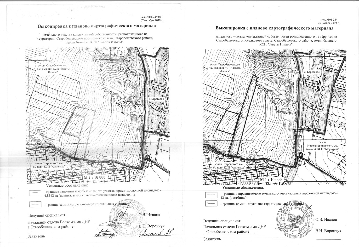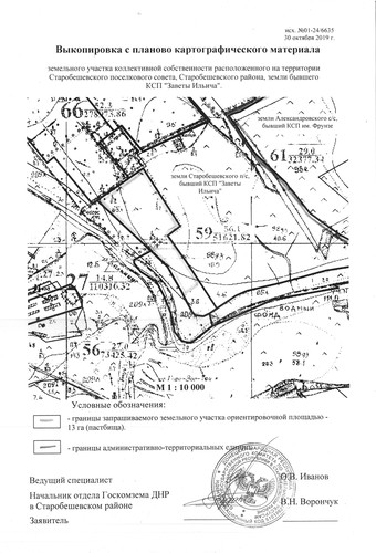 Администрация Старобешевского района информирует о неиспользуемых земельных участках сельскохозяйственного назначения и о намерении передать их в аренду для использования их по целевому назначению заинтересованным лицам. Просим предоставить информацию от собственников (пользователей), наследников, правопреемников, уполномоченных лицах о намерении использования указанных земельных участков, предоставить согласие на передачу их в аренду по телефону: 2-25-14 отдел архитектуры администрации каб. 113, в соответствии с исполнением полномочий, предусмотренных пунктом 5.5 Временного порядка предоставления в постоянное пользование и передачи в аренду земельных участков на территории Донецкой Народной Республики, утвержденного Постановлением Совета Министров Донецкой Народной Республики от 02.09.2015 №17-15 (с изменениями и дополнениями). Земельныеучастки расположенные на территории Старобешевской поселковой администрации, земли бывшего КСП «Заветы Ильича» (согласно приложениям): земельный участок площадью -13,0 га.пастбища; земельный участокплощадью - 50,0 га.земель сельскохозяйственного назначения; земельный участок площадью – 12,0 га.пастбища; земельный участок площадью – 4,8142 га.пашня; земельный участок площадью – 5,7968 га.пастбища, кадастровый номер 1424555100:02:000:0451; земельный участок площадью – 5,0365 га.пастбища, кадастровый номер 1424555100:02:000:0452; земельный участок площадью – 4,8443 га.пастбища, кадастровый номер 1424555100:02:000:0453; По истечению двухмесячного срока, в случае отсутствия официальной информации от собственников (пользователей), а также их наследников, правопреемников и уполномоченных лиц, будет принято решение уполномоченным органом исполнительной власти о передаче заинтересованному лицу (арендатору) земельного участка в аренду для использования по целевому назначению. Договор аренды таких земельных участков заключается на срок до момента обращения собственников (пользователей), а также их наследников, правопреемников и уполномоченных лиц земельных участков в работе по уборке урожая, но не менее одного года. В случае отсутствия информации от собственников (пользователей), а также их наследников, правопреемников и уполномоченных лиц о намерении возобновить свои права в части использования земельных участков за один месяц до окончания действия договоров аренды, договор возобновляется (продлевается) на такойже срок, путем заключения дополнительного соглашения с заинтересованным лицом (арендатором)