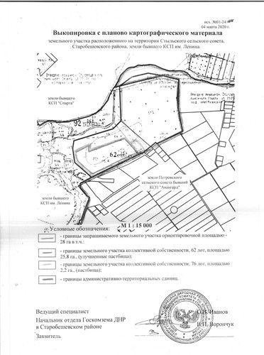 | Администрация Старобешевского района информирует о неиспользуемых земельных участках сельскохозяйственного назначения и о намерении передать их в аренду для использования их по целевому назначению заинтересованным лицам. Просим предоставить информацию от собственников (пользователей), наследников, правопреемников, уполномоченных лицах о намерении использования указанных земельных участков, предоставить согласие на передачу их в аренду по телефону: 2-25-14 отдел архитектуры администрации каб. 113, в соответствии с исполнением полномочий, предусмотренных пунктом 5.5 Временного порядка предоставления в постоянное пользование и передачи в аренду земельных участков на территории Донецкой Народной Республики, утвержденного Постановлением Совета Министров Донецкой Народной Республики от 02.09.2015 №17-15 (с изменениями и дополнениями). Земельныйучасток расположен на территории Стыльской сельскойадминистрации, земли бывшего КСП им. Ленина (согласно приложения): земельный участок общей площадью –28,0 га., их них 25,8 га.пастбища улучшенные, 2,2 га.пастбища естественные; По истечению двухмесячного срока, в случае отсутствия официальной информации от собственников (пользователей), а также их наследников, правопреемников и уполномоченных лиц, будет принято решение уполномоченным органом исполнительной власти о передаче заинтересованному лицу (арендатору) земельного участка в аренду для использования по целевому назначению. Договор аренды таких земельных участков заключается на срок до момента обращения собственников (пользователей), а также их наследников, правопреемников и уполномоченных лиц земельных участков в работе по уборке урожая, но не менее одного года. В случае отсутствия информации от собственников (пользователей), а также их наследников, правопреемников и уполномоченных лиц о намерении возобновить свои права в части использования земельных участков за один месяц до окончания действия договоров аренды, договор возобновляется (продлевается) на такойже срок, путем заключения дополнительного соглашения с заинтересованным лицом (арендатором)