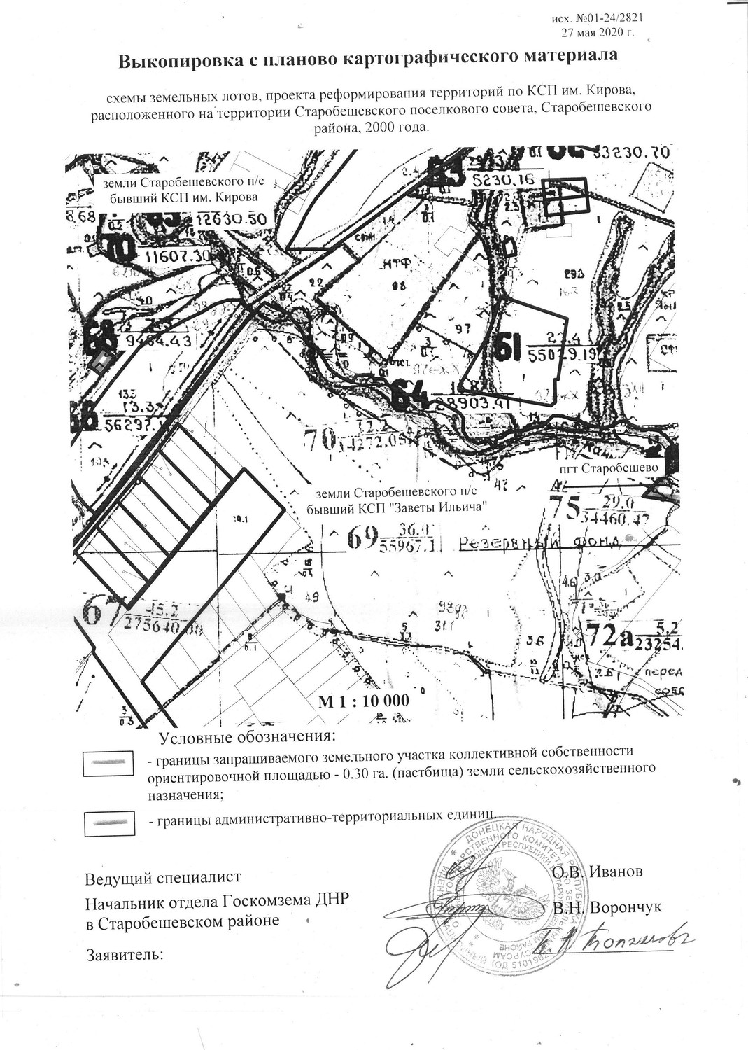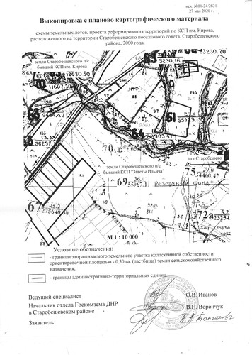 | Администрация Старобешевского района информирует о неиспользуемых земельных участках сельскохозяйственного назначения и о намерении передать их в аренду для использования их по целевому назначению заинтересованным лицам. Просим предоставить информацию от собственников (пользователей), наследников, правопреемников, уполномоченных лицах о намерении использования указанных земельных участков, предоставить согласие на передачу их в аренду по телефону: 2-25-14 отдел архитектуры администрации каб. 113, в соответствии с исполнением полномочий, предусмотренных пунктом 5.5 Временного порядка предоставления в постоянное пользование и передачи в аренду земельных участков на территории Донецкой Народной Республики, утвержденного Постановлением Совета Министров Донецкой Народной Республики от 02.09.2015 №17-15 (с изменениями и дополнениями). Земельный участок расположен на территории Старобешевской поселковой администрации, земли бывшего КСП им. Кирова (согласно приложения): земельный участок площадью -0,30 га.пастбища, земли сельскохозяйственного назначения. По истечению двухмесячного срока, в случае отсутствия официальной информации от собственников (пользователей), а также их наследников, правопреемников и уполномоченных лиц, будет принято решение уполномоченным органом исполнительной власти о передаче заинтересованному лицу (арендатору) земельного участка в аренду для использования по целевому назначению. Договор аренды таких земельных участков заключается на срок до момента обращения собственников (пользователей), а также их наследников, правопреемников и уполномоченных лиц земельных участков в работе по уборке урожая, но не менее одного года. В случае отсутствия информации от собственников (пользователей), а также их наследников, правопреемников и уполномоченных лиц о намерении возобновить свои права в части использования земельных участков за один месяц до окончания действия договоров аренды, договор возобновляется (продлевается) на такойже срок, путем заключения дополнительного соглашения с заинтересованным лицом (арендатором)