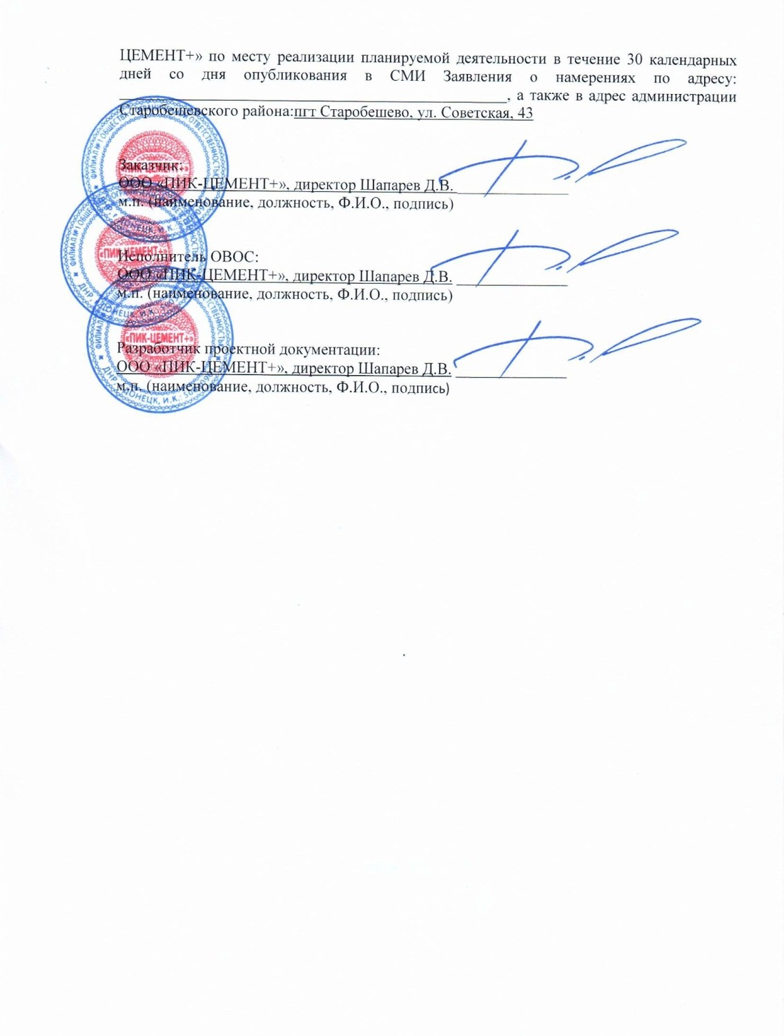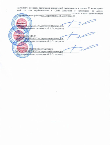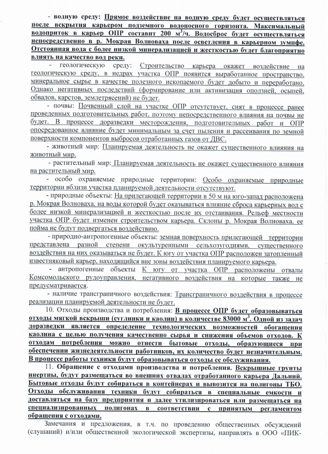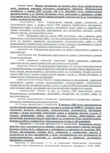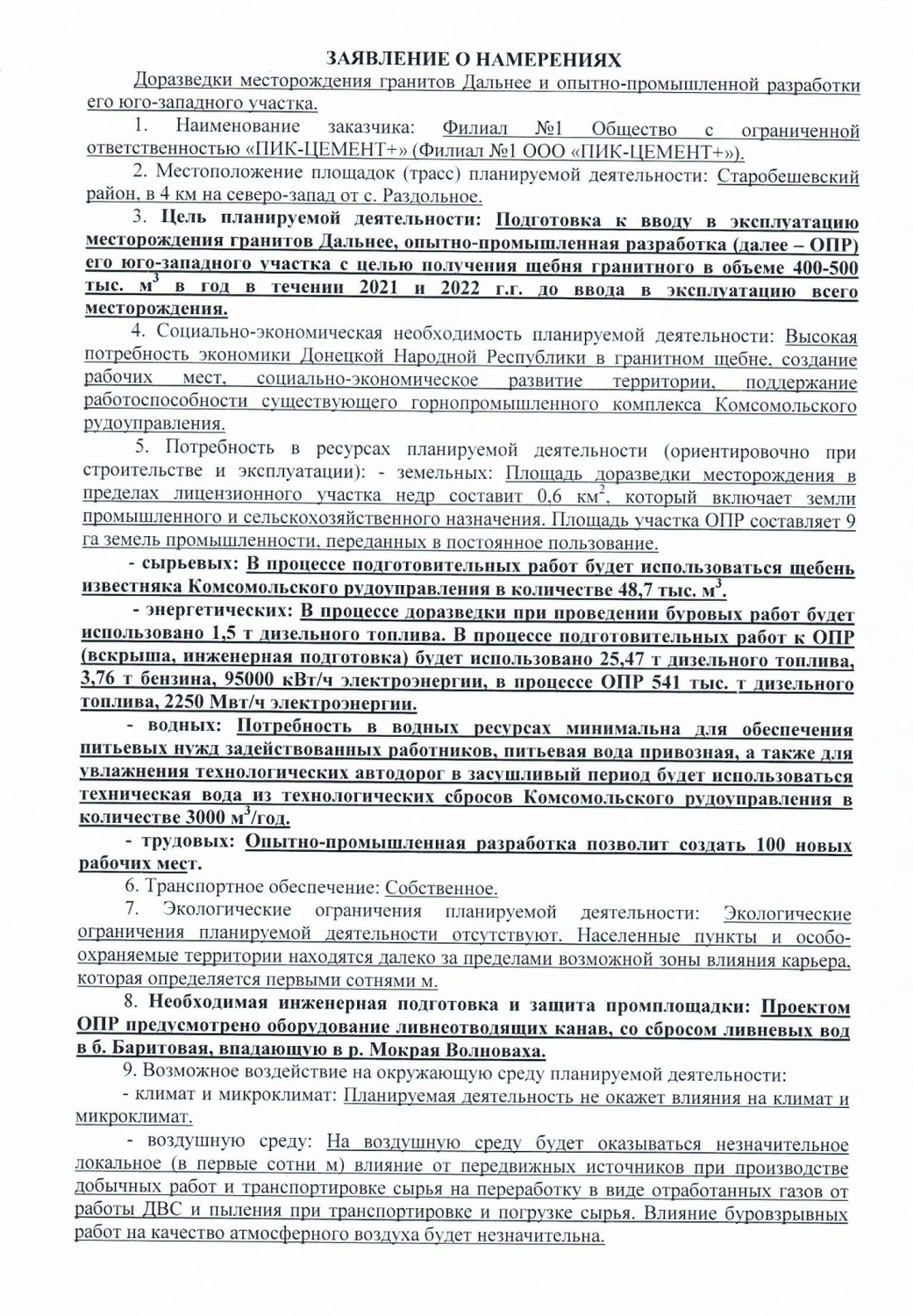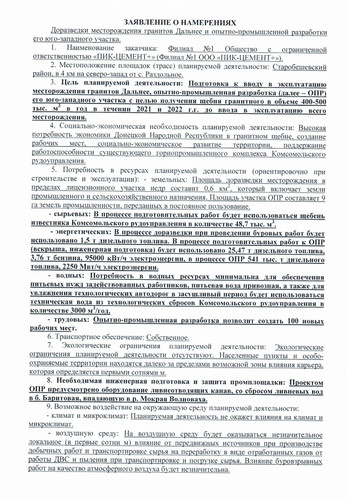 | ЗАЯВЛЕНИЕ О НАМЕРЕНИЯХ Доразведки месторождения гранитов Дальнее и опытно-промышленной разработки его юго-западного участка. 1. Наименование заказчика: Филиал №1 Общество с ограниченной ответственностью «ПИК-ЦЕМЕНТ+» (Филиал №1 ООО «ПИК-ЦЕМЕНТ+»), 2. Местоположение площадок (трасс) планируемой деятельности: Старобешевский район, в 4 км на северо-запад от с. Раздольное. 3. Цель планируемой деятельности: Подготовка к вводу в эксплуатацию месторождения гранитов Дальнее, опытно-промышленная разработка (далее - ОПР) его юго-западного участка с целью получения щебня гранитного в объеме 400-500 тыс, м3 в год в течении 2021 и 2022 г.г. до ввода в эксплуатацию всего месторождения. 4. Социально-экономическая необходимость планируемой деятельности: Высокая потребность экономики Донецкой Народной Республики в гранитном щебне, создание рабочих мест. социально-экономическое развитие территории. поддержание работоспособности существующего горнопромышленного комплекса Комсомольского рудоуправления. 5. Потребность в ресурсах планируемой деятельности (ориентировочно при строительстве и эксплуатации): - земельных: Площадь доразведки месторождения в пределах лицензионного участка недр составит 0,6 км~. который включает земли промышленного и сельскохозяйственного назначения. Площадь участка ОПР составляет 9 га земель промышленности, переданных в постоянное пользование. - сырьевых: В процессе подготовительных работ будет использоваться щебень известняка Комсомольского рудоуправления в количестве 48,7 тыс, м3. - энергетических: В процессе доразведки при проведении буровых работ будет использовано 1,5 т дизельного топлива. В процессе подготовительных работ к ОПР (вскрыша, инженерная подготовка) будет использовано 25,47 т дизельного топлива, 3,76 т бензина, 95000 кВт/ч электроэнергии, в процессе ОПР 541 тыс, т дизельного топлива, 2250 Мвт/ч электроэнергии. - водных: Потребность в водных ресурсах минимальна для обеспечения питьевых нужд задействованных работников, питьевая вода привозная, а также для увлажнения технологических автодорог в засушливый период будет использоваться техническая вода из технологических сбросов Комсомольского рудоуправления в количестве 3000 м3/год. - трудовых: Опытно-промышленная разработка позволит создать 100 новых рабочих мест. 6. Транспортное обеспечение: Собственное. 7. Экологические ограничения планируемой деятельности: Экологические ограничения планируемой деятельности ОТСУТСТВУЮТ. Населенные пункты и особо- охраняемые территории находятся далеко за пределами возможной зоны влияния карьера, которая определяется первыми сотнями м. 8. Необходимая инженерная подготовка и защита промплощадки: Проектом ОПР предусмотрено оборудование ливнеотводящих канав, со сбросом ливневых вод в б. Баритовая, впадающую в р. Мокрая Волноваха. 9. Возможное воздействие на окружающую среду планируемой деятельности: - климат и микроклимат: Планируемая деятельность не окажет влияния на климат и микроклимат. - воздушную среду: На ВОЗДУШНУЮ среду будет оказываться незначительное локальное (в первые сотни м) влияние от передвижных источников при производстве добычных работ и транспортировке сырья на переработку в виде отработанных газов от работы ЛВС и пыления при транспортировке и погрузке сырья. Влияние буровзрывных работ на качество атмосфер