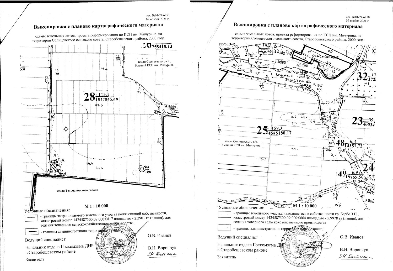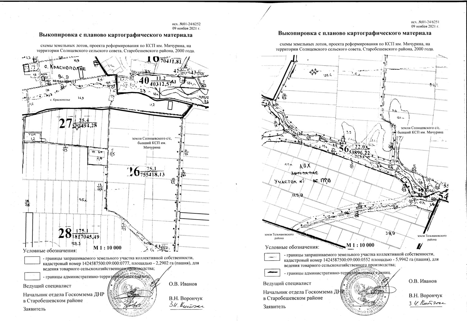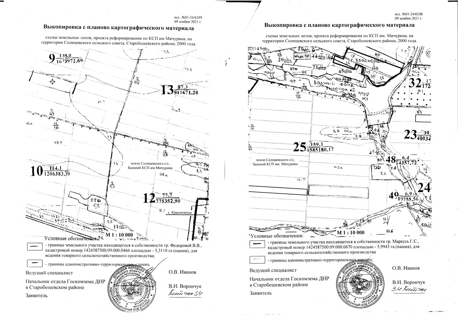| Администрация Старобешевского района информирует о неиспользуемых земельных участках сельскохозяйственного назначения и о намерении передать их в аренду для использования их по целевому назначению заинтересованным лицам. Просим предоставить информацию от собственников (пользователей), наследников, правопреемников, уполномоченных лицах о намерении использования указанных земельных участков, предоставить согласие на передачу их в аренду по телефону: 2-25-14 отдел архитектуры администрации каб. 113, в соответствии с исполнением полномочий, предусмотренных пунктом 5.5 Временного порядка предоставления в постоянное пользование и передачи в аренду земельных участков на территории Донецкой Народной Республики, утвержденного Постановлением Совета Министров Донецкой Народной Республики от 02.09.2015 №17-15 (с изменениями и дополнениями). Земельныйучасток расположен на территории Солнцевскойсельской администрации, земли бывшего КСП им. Мичурина, общейплощадью 27,8778 га пашни, из них 10,5745 га земли коллективной собственности; 5,9945 га. – земли частной собственности гр. Маркусь Г.С.; 5,3110 га – земли частной собственности Фдоровой В.В.; 5,9978 га – земли частной собственности Барбо З.П.(согласно приложения): По истечению двухмесячного срока, в случае отсутствия официальной информации от собственников (пользователей), а также их наследников, правопреемников и уполномоченных лиц, будет принято решение уполномоченным органом исполнительной власти о передаче заинтересованному лицу (арендатору) земельного участка в аренду для использования по целевому назначению. Договор аренды таких земельных участков заключается на срок до момента обращения собственников (пользователей), а также их наследников, правопреемников и уполномоченных лиц земельных участков в работе по уборке урожая, но не менее одного года. В случае отсутствия информации от собственников (пользователей), а также их наследников, правопреемников и уполномоченных лиц о намерении возобновить свои права в части использования земельных участков за один месяц до окончания действия договоров аренды, договор возобновляется (продлевается) на такойже срок, путем заключения дополнительного соглашения с заинтересованным лицом (арендатором)