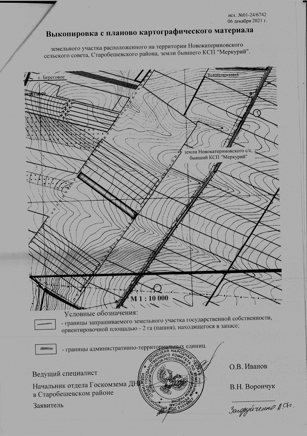 | Администрация Старобешевского района информирует о неиспользуемых земельных участках сельскохозяйственного назначения и о намерении передать их в аренду для использования их по целевому назначению заинтересованным лицам. Просим предоставить информацию от собственников (пользователей), наследников, правопреемников, уполномоченных лицах о намерении использования указанных земельных участков, предоставить согласие на передачу их в аренду по телефону: 2-25-14 отдел архитектуры администрации каб. 113, в соответствии с исполнением полномочий, предусмотренных пунктом 5.5 Временного порядка предоставления в постоянное пользование и передачи в аренду земельных участков на территории Донецкой Народной Республики, утвержденного Постановлением Совета Министров Донецкой Народной Республики от 02.09.2015 №17-15 (с изменениями и дополнениями). Земельный участок расположен на территории Новоекатериновской сельской администрации (бывший КСП «Меркурий»), земли государственной собственности, площадью 2,0 га пашни, находящийся в запасе(согласно приложения): По истечению двухмесячного срока, в случае отсутствия официальной информации от собственников (пользователей), а также их наследников, правопреемников и уполномоченных лиц, будет принято решение уполномоченным органом исполнительной власти о передаче заинтересованному лицу (арендатору) земельного участка в аренду для использования по целевому назначению. Договор аренды таких земельных участков заключается на срок до момента обращения собственников (пользователей), а также их наследников, правопреемников и уполномоченных лиц земельных участков в работе по уборке урожая, но не менее одного года. В случае отсутствия информации от собственников (пользователей), а также их наследников, правопреемников и уполномоченных лиц о намерении возобновить свои права в части использования земельных участков за один месяц до окончания действия договоров аренды, договор возобновляется (продлевается) на такойже срок, путем заключения дополнительного соглашения с заинтересованным лицом (арендатором)