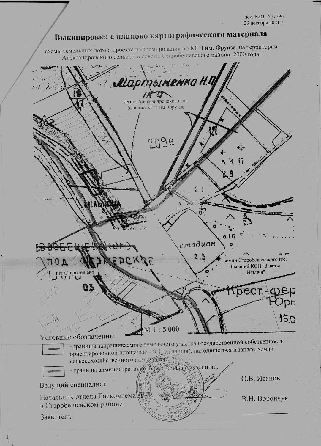 | Администрация Старобешевского района информирует о неиспользуемых земельных участках сельскохозяйственного назначения и о намерении передать их в аренду для использования их по целевому назначению заинтересованным лицам. Просим предоставить информацию от собственников (пользователей), наследников, правопреемников, уполномоченных лицах о намерении использования указанных земельных участков, предоставить согласие на передачу их в аренду по телефону: 2-25-14 отдел архитектуры администрации каб. 113, в соответствии с исполнением полномочий, предусмотренных пунктом 5.5 Временного порядка предоставления в постоянное пользование и передачи в аренду земельных участков на территории Донецкой Народной Республики, утвержденного Постановлением Совета Министров Донецкой Народной Республики от 02.09.2015 №17-15 (с изменениями и дополнениями). Земельный участок расположен на территории Александровской сельской администрации (бывший КСП им. Фрунзе), земли государственной собственности, площадью 0,4 га пашни, находящийся в запасе(согласно приложения): По истечению двухмесячного срока, в случае отсутствия официальной информации от собственников (пользователей), а также их наследников, правопреемников и уполномоченных лиц, будет принято решение уполномоченным органом исполнительной власти о передаче заинтересованному лицу (арендатору) земельного участка в аренду для использования по целевому назначению. Договор аренды таких земельных участков заключается на срок до момента обращения собственников (пользователей), а также их наследников, правопреемников и уполномоченных лиц земельных участков в работе по уборке урожая, но не менее одного года. В случае отсутствия информации от собственников (пользователей), а также их наследников, правопреемников и уполномоченных лиц о намерении возобновить свои права в части использования земельных участков за один месяц до окончания действия договоров аренды, договор возобновляется (продлевается) на такой же срок, путем заключения дополнительного соглашения с заинтересованным лицом (арендатором)